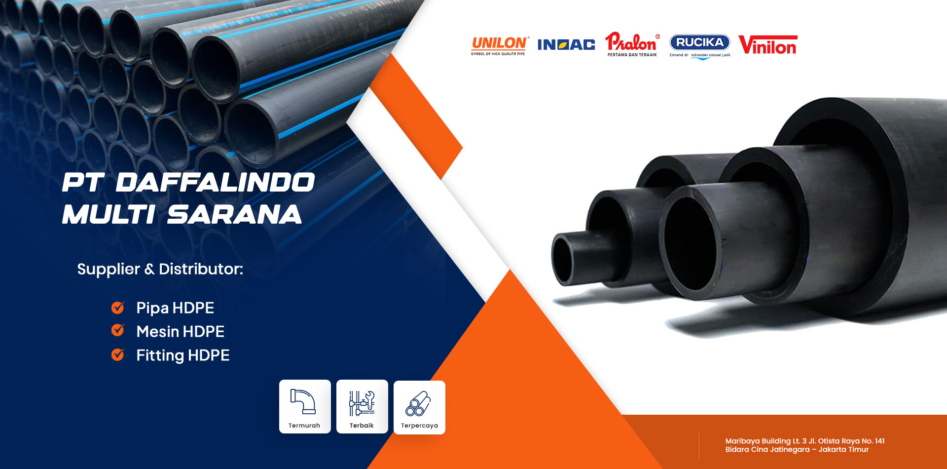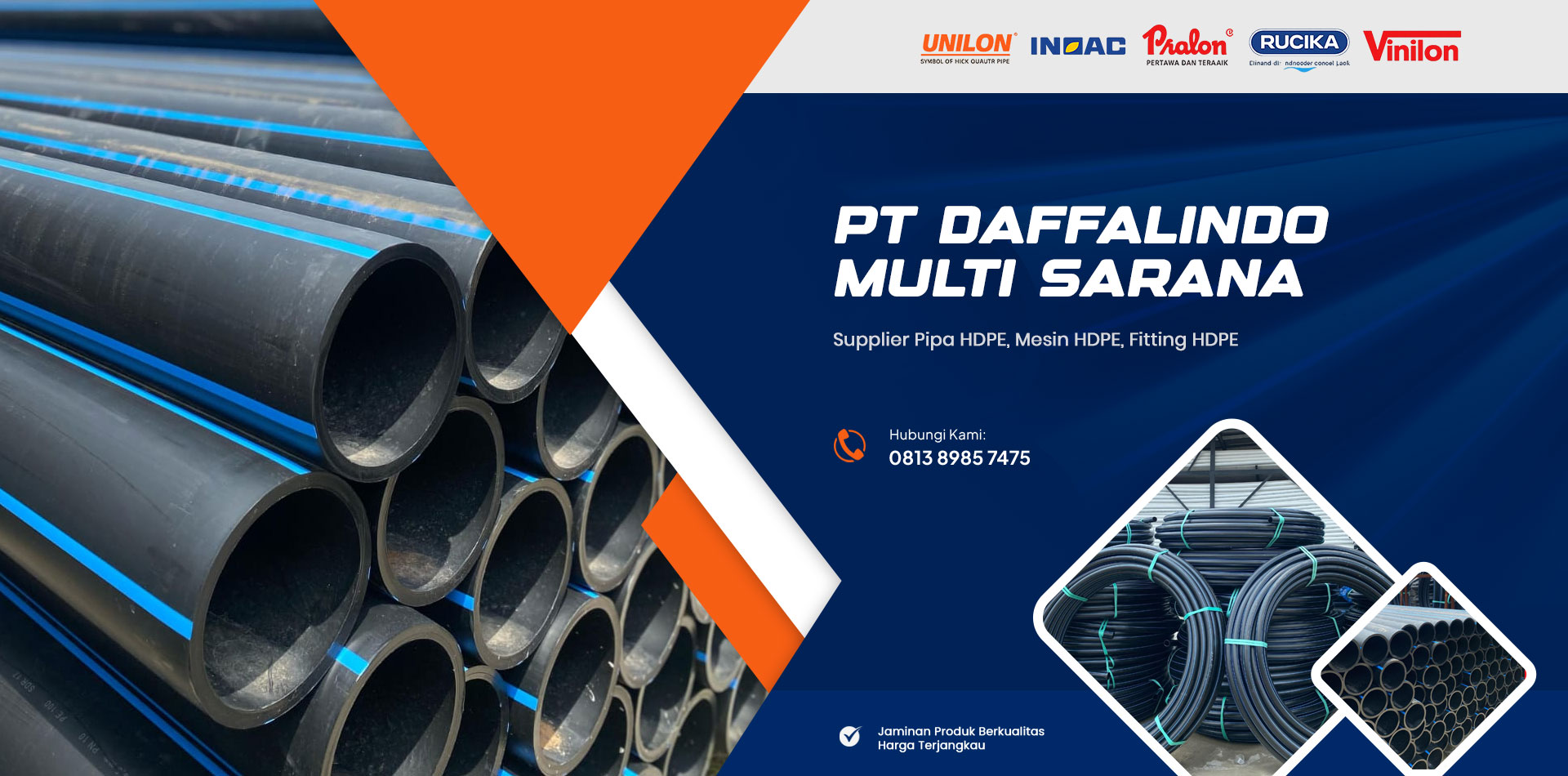 PT Daffalindo Multi Sarana adalah perusahaan yang bergerak di bidang penyediaan berbagai kebutuhan perpipaan berkualitas tinggi di Indonesia. Kami fokus pada penjualan Pipa HDPE, Fitting HDPE, dan Mesin HDPE untuk mendukung berbagai proyek, mulai dari sistem air bersih, irigasi, hingga kebutuhan industri dan infrastruktur.